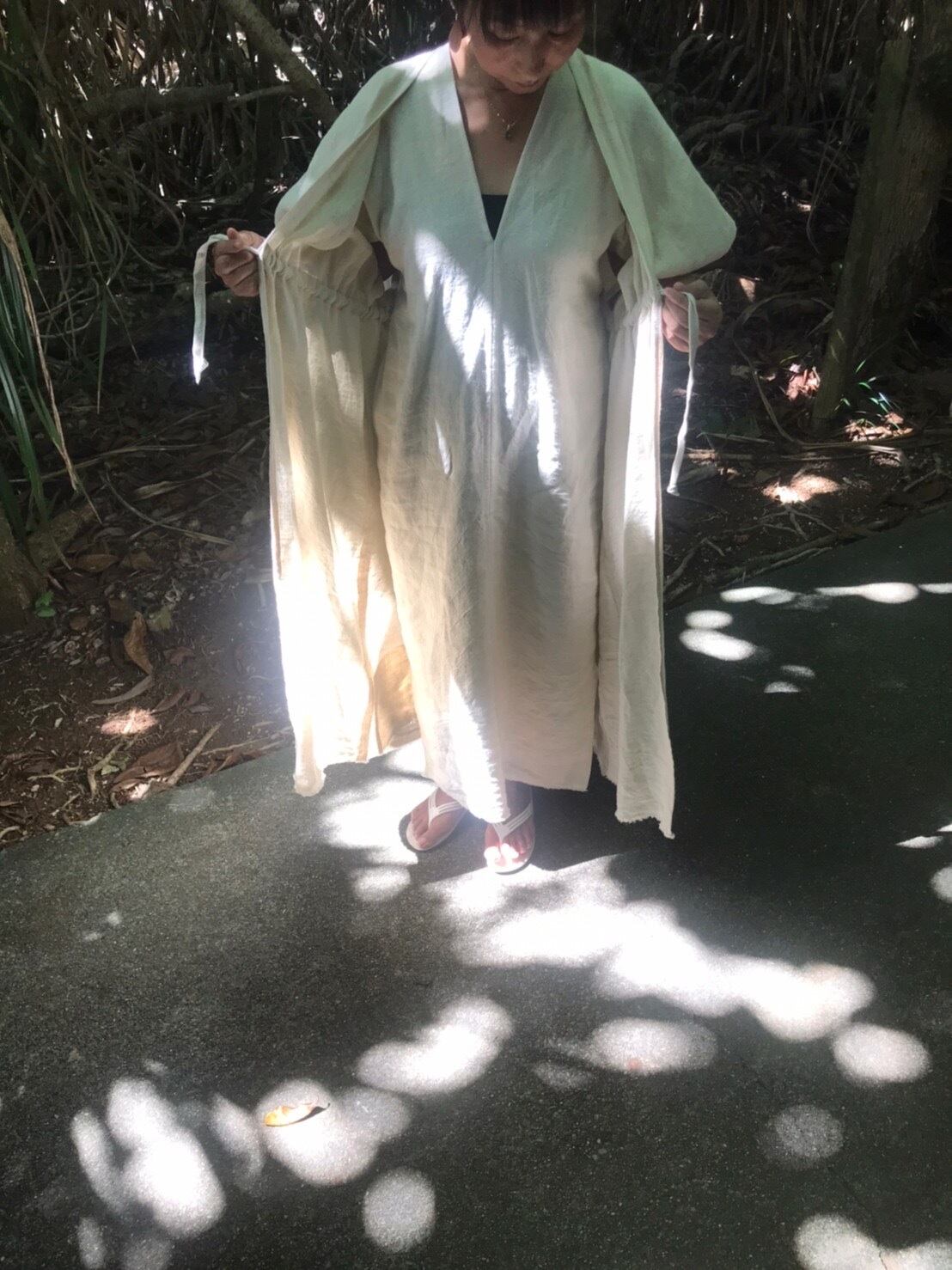 下に着ているのは貫頭衣タイプの大麻ヘンプワンピース丈120㌢です