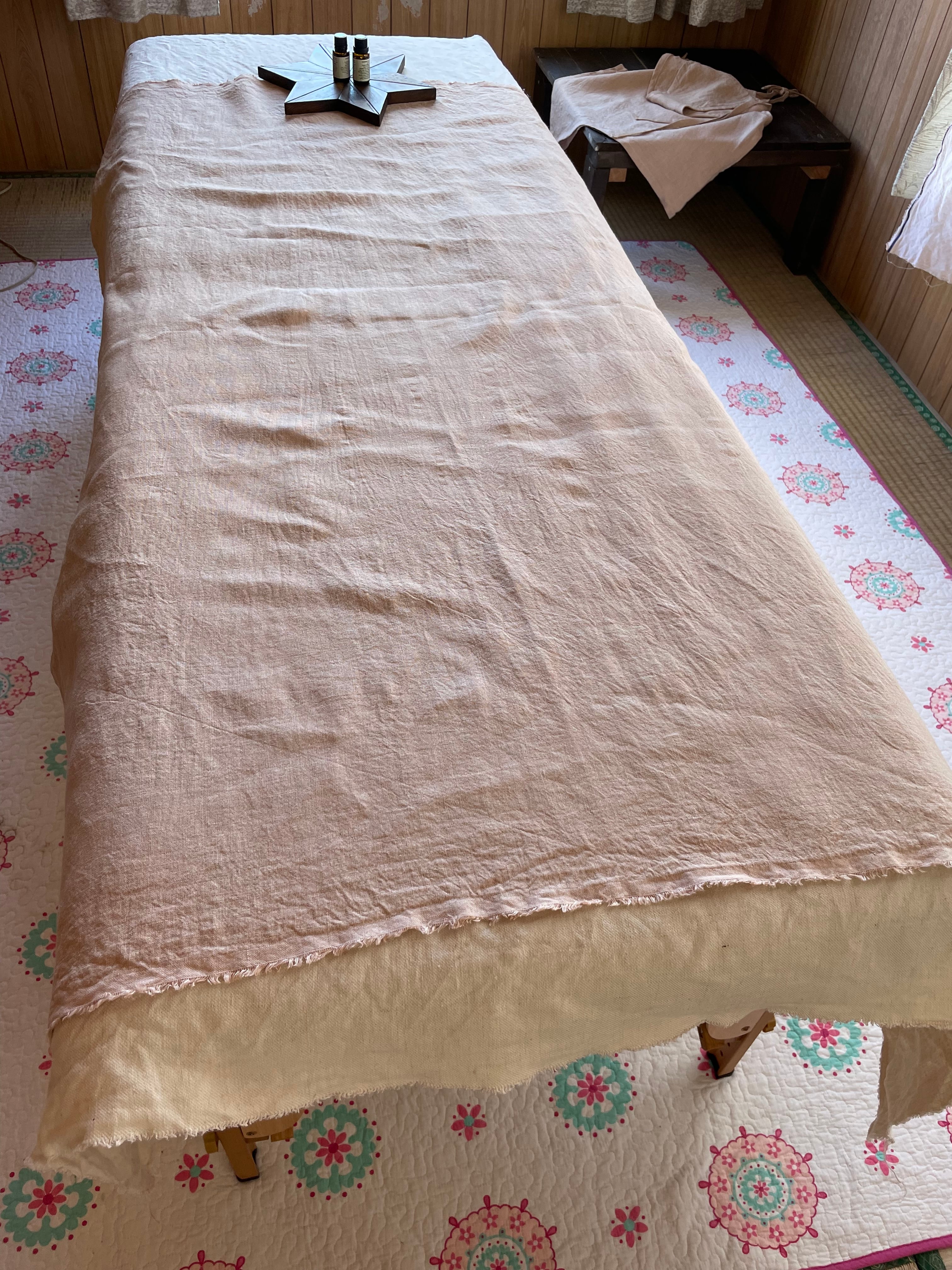 大麻ヘンプ自体にエネルギーを払い清める作用があるので、「布をかけるだけでも身体が楽になる」「布をかけられると安心して身体が緩む」など施術をされる方がよりリラックスした状態になります